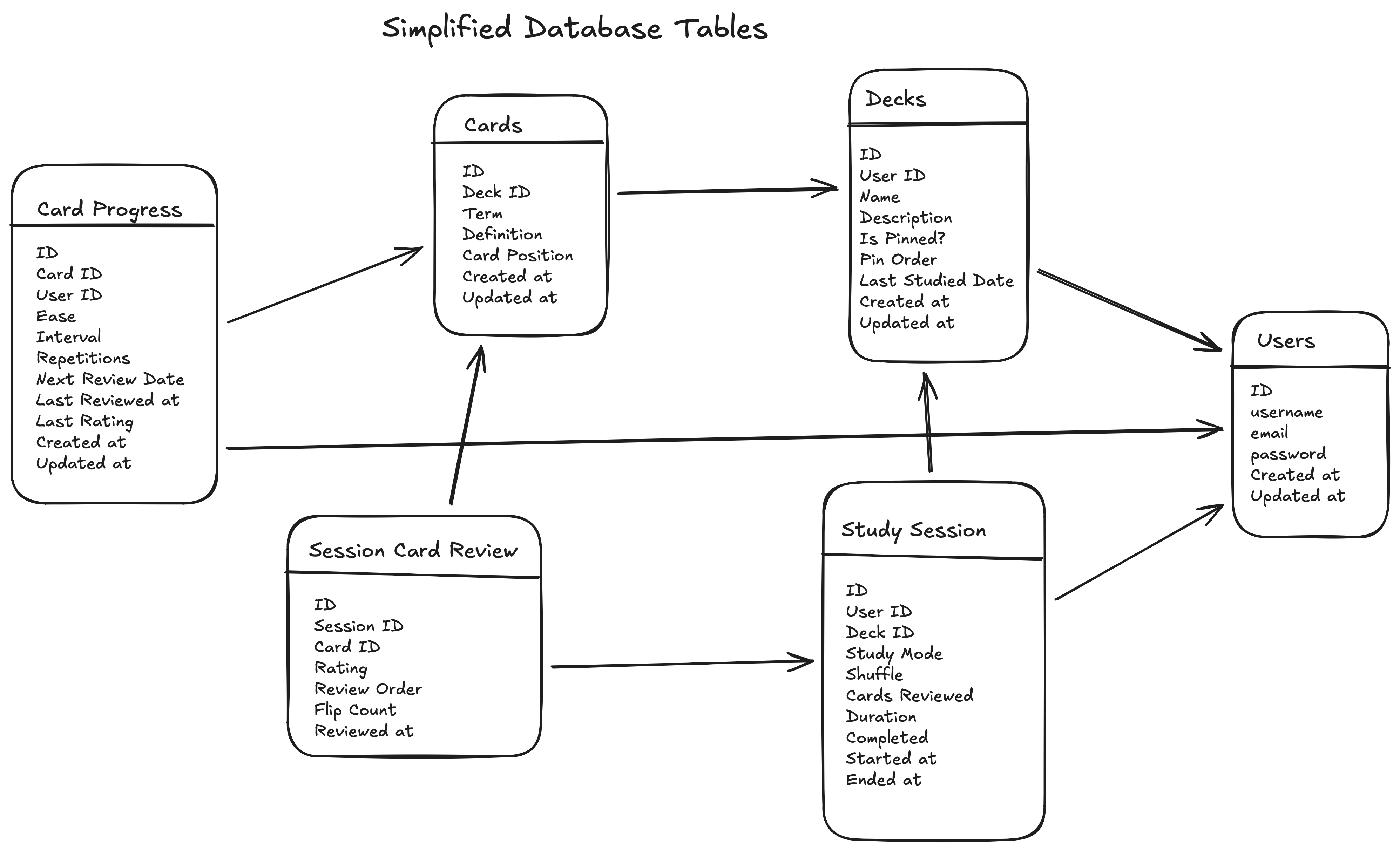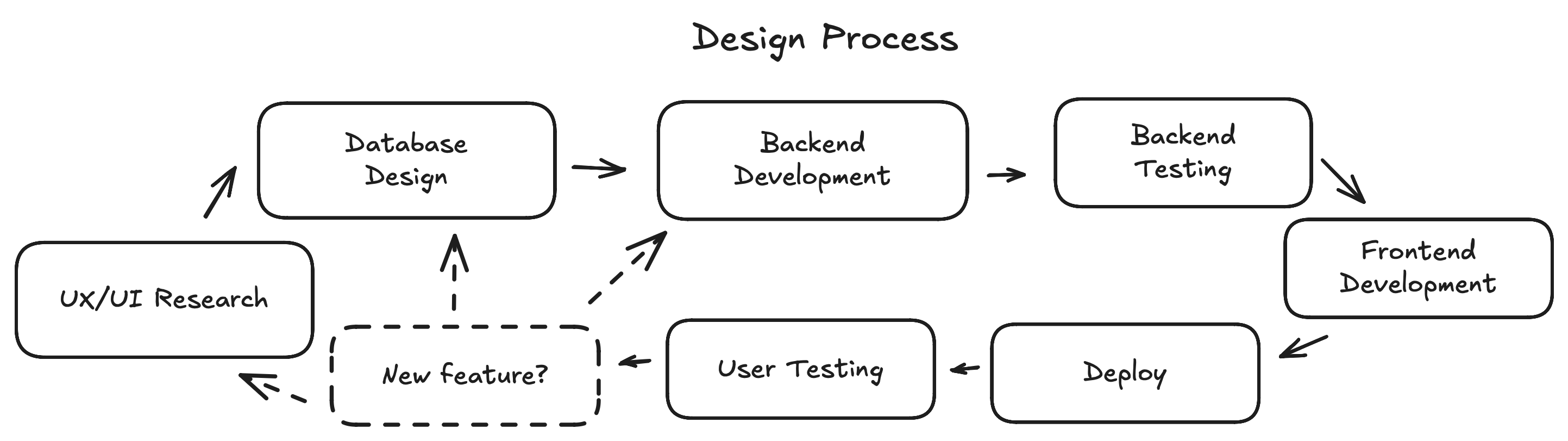 My process started with understanding user needs (originally my own). I evaluated existing flashcard apps, noted what I liked and disliked, and created a user requirements list to guide development. Once a basic UI wireframe was sketched out, I designed the backend database schema based on those requirements, using Google and LLM conversations to brainstorm and finalize the structure. The first version was developed locally with PostgreSQL, and I implemented JWT authentication from the start with mobile compatibility and production scaling in mind. After the MVP was functional, I researched hosting options prioritizing freemium tiers, ultimately deploying with Vercel, Railway, and Supabase.